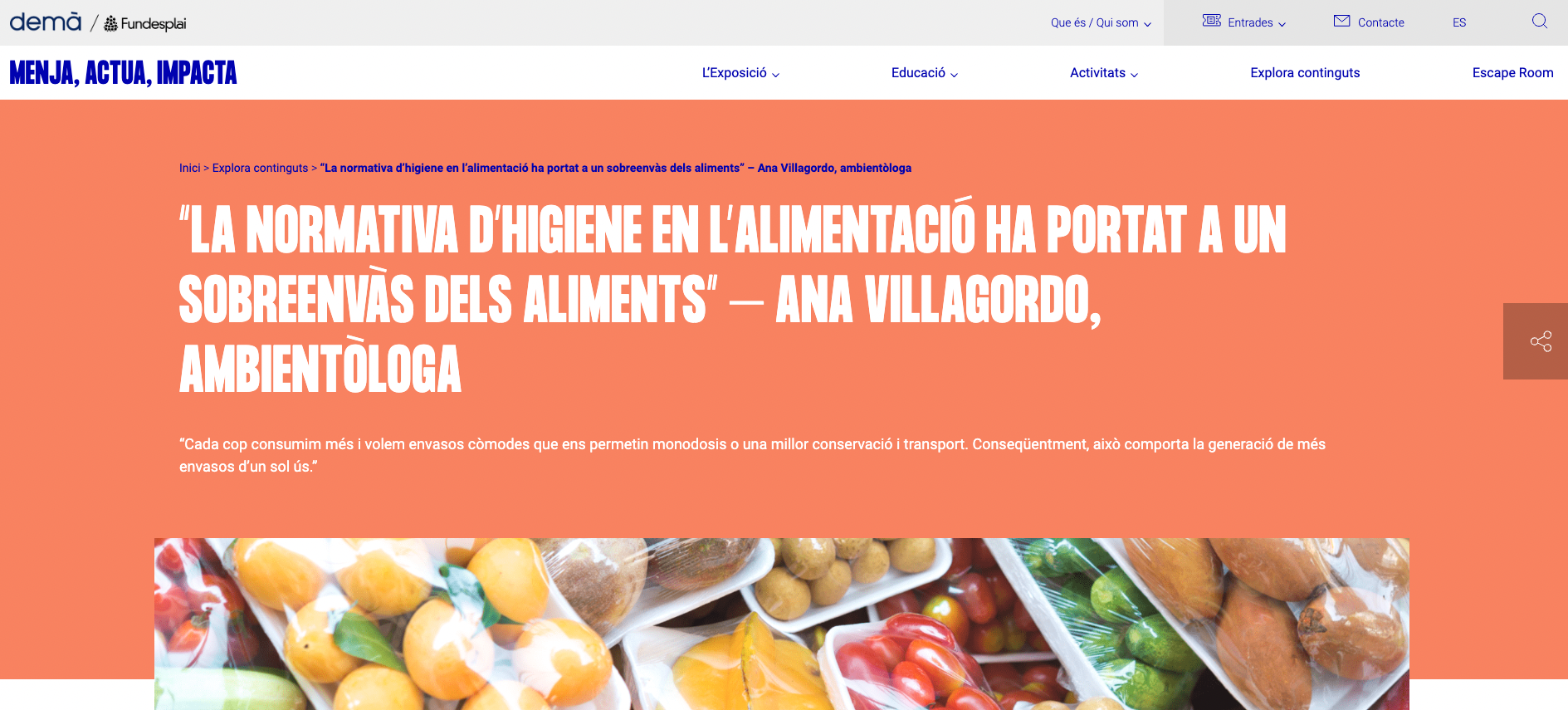 He pogut participar en l’elaboració de continguts de l’àmbit 2, concretament de la instal·lació dedicada als envasos associats a la conservació, distribució, emmagatzematge i venta de menjar. A partir del meu feedback i de treballar-ho amb l’equip de l’exposició, el resultat ja es pot visitar. Com poder menjar sense consumir tants envasos (sobretot, plàstic), com fer la compra de menjar i comprar només menjar (sense plàstic ni cap altre material afegit)… aquests i altres continguts es poden visitar fins el juliol del 2023. A continuació, el vídeo introductori de l’exposició, molt impactant i emocionant: el rap de l’alimentació!