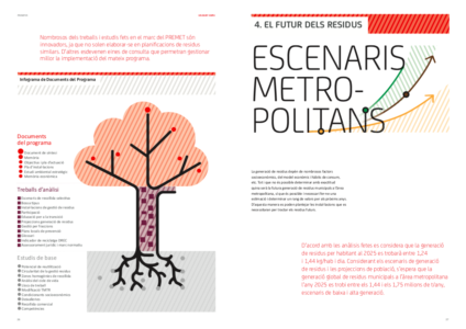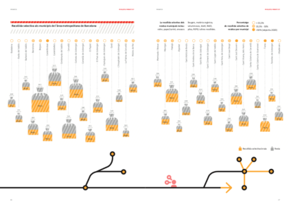 Des de l’Àrea Metropolitana de Barcelona (AMB) i Barcelona Regional em van fer l’encàrrec de coordinar gràficament i redactar un document de síntesi del recentment aprovat PREMET25 (Programa Metropolità de Prevenció i Gestió de Recursos i Residus Municipals 2019-2025). Per poder portar-ho a terme he comptat amb la col·laboració de Lapage Original que ha realitzat la feina gràfica. L’objectiu era aconseguir que un document molt tècnic, la Memòria del Programa, comptés amb una versió més curta i divulgativa que permetés arribar tant al públic més especialitzat com a la ciutadania en general. Aprofitant aquest exercici, però, es va considerar necessari crear una línia gràfica pròpia. A partir d’algunes sessions de treball i d’una feina de gabinet, es van proposar opcions gràfiques que responguessin a un briefing conjunt construït entre tots els agents que havien participat de l’elaboració dels Programa. Com a resultat d’aquest exercici es va dissenyar un grafisme que s’ha aplicat en tots els eixos del PREMET25 així com en gran part de les seves figures (taules, gràfiques i infografies), tant en el document de síntesi com en el web.