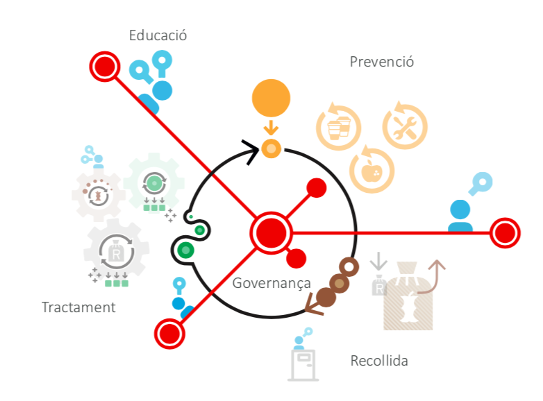 Esquema resum del PREMET25 que suma totes les seves estratègies de manera circular i dinàmica. Reduir en origen, separar millor, innovar en el tractament, comunicar des de l’educació i actuar amb noves eines de governança: aquest és el resum d’un Programa que va més enllà de l’estricta gestió de residus i proposa un canvi radical que implica la ciutadania de manera directa.
