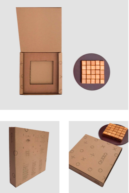 Com passar d’un envàs de cartró durable d’una joguina amb molt de caràcter, de fusta, el Quixo; a una altra caixa de cartró, que li confereix encara més caràcter al joc i que no necessita tintes.
