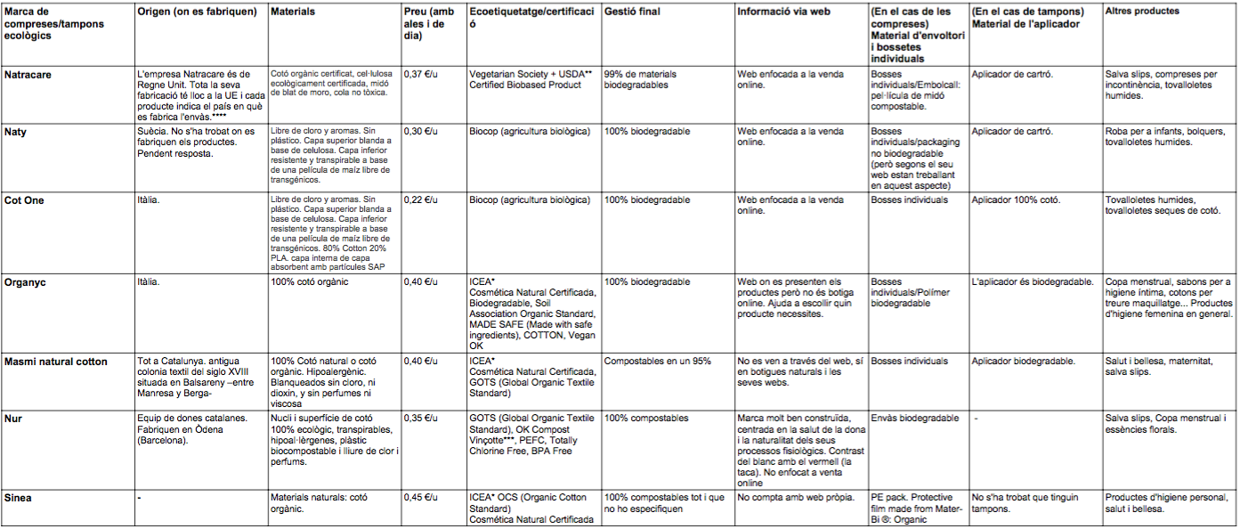 Continuen essent, però, compreses amb ales, ultrafines, ultres de nit, de dia, etc. Però no estan blanquejades (sense clor i dioxines), no contenen perfums ni materials superaboserbents, ni residus de pesticides o herbicides. Solen ser de producció més local (no més enllà de la UE) i la majoria estan certificades, com es pot comprovar en la taula comparativa realitzada específicament en aquesta recerca.