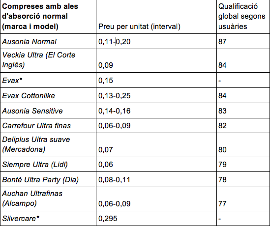 Comparativa de compreses convencionals existents al mercat, destacant el seu preu per unitat i la qualificació segons les usuàries consultades. Font: OCU (desembre, 2016).        * Revista Consumer. No es compta amb la valoració de les usuàries.