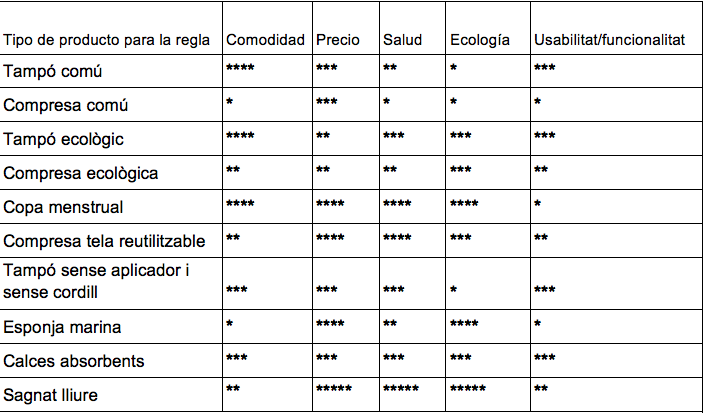 Parlar d’alternatives sostenibles a les compreses i tampons va més enllà d’analitzar i comparar productes segons la seva bondat ambiental i altres criteris (vegeu Taula)[3] , tot i que ho hem fet. El resultat és el següent valorant comoditat, preu, sostenibilitat, usabilitat i salut: 1. Sagnat lliure/ 2. Copa menstrual/ 3. Tampó ecològic/ 4. Calces absorbents i compreses de tela/ 5. Tampó comú i tampó sense aplicador/ 6. Esponja marina / 7. Compresa ecològica / 8. Compresa comú. Tot i aquests resultats, si preguntes al teu voltant, moltes dones fan servir el darrer mètode, la compresa comú, compaginat amb tampons. No moltes fan servir les opcions similars però ecològiques, però el que sí sembla és que cada cop més dones s’estan apuntant a la copa menstrual. El sagnat lliure és, de moment, desconegut i genera moltes reticències. Tot arribarà.