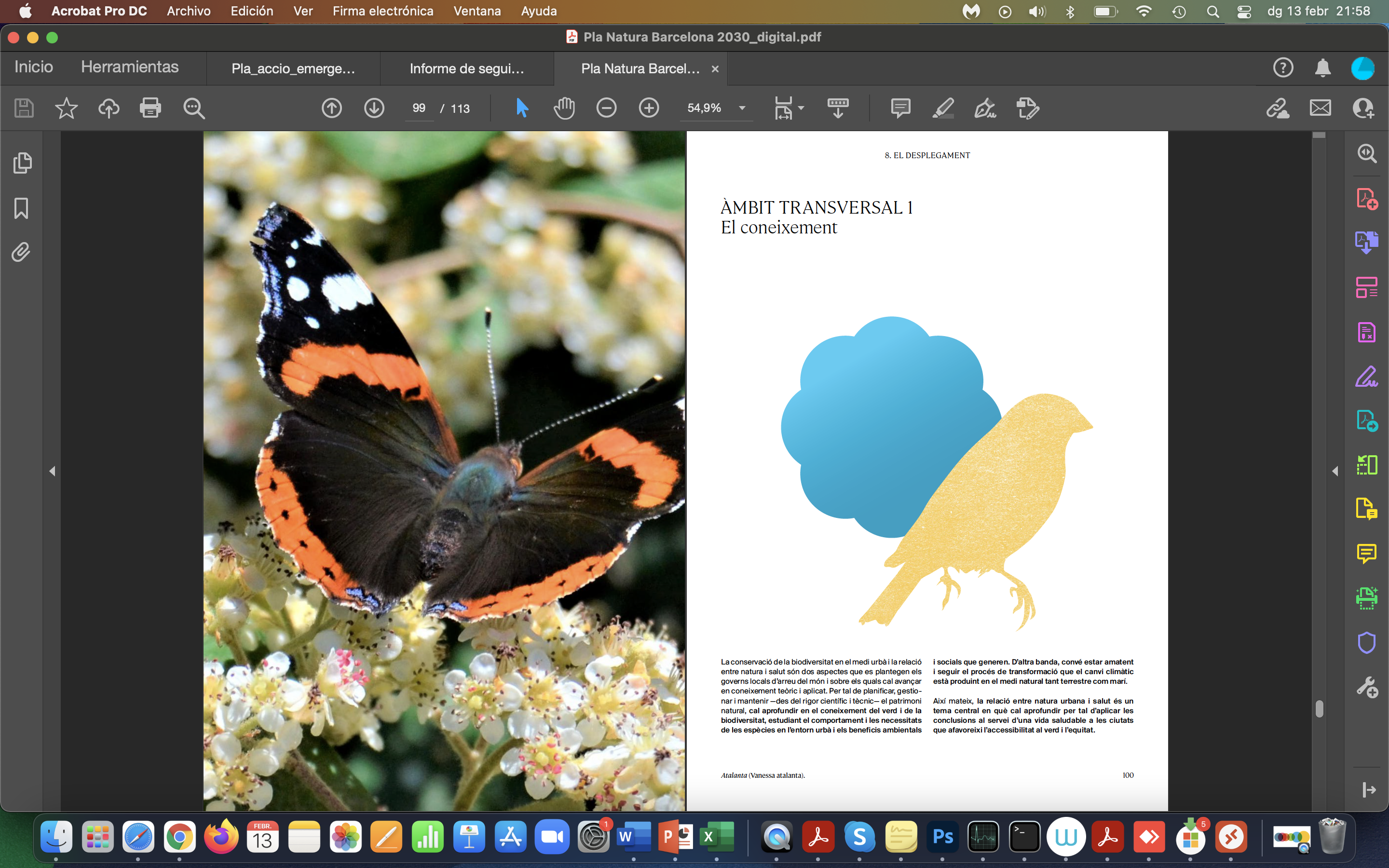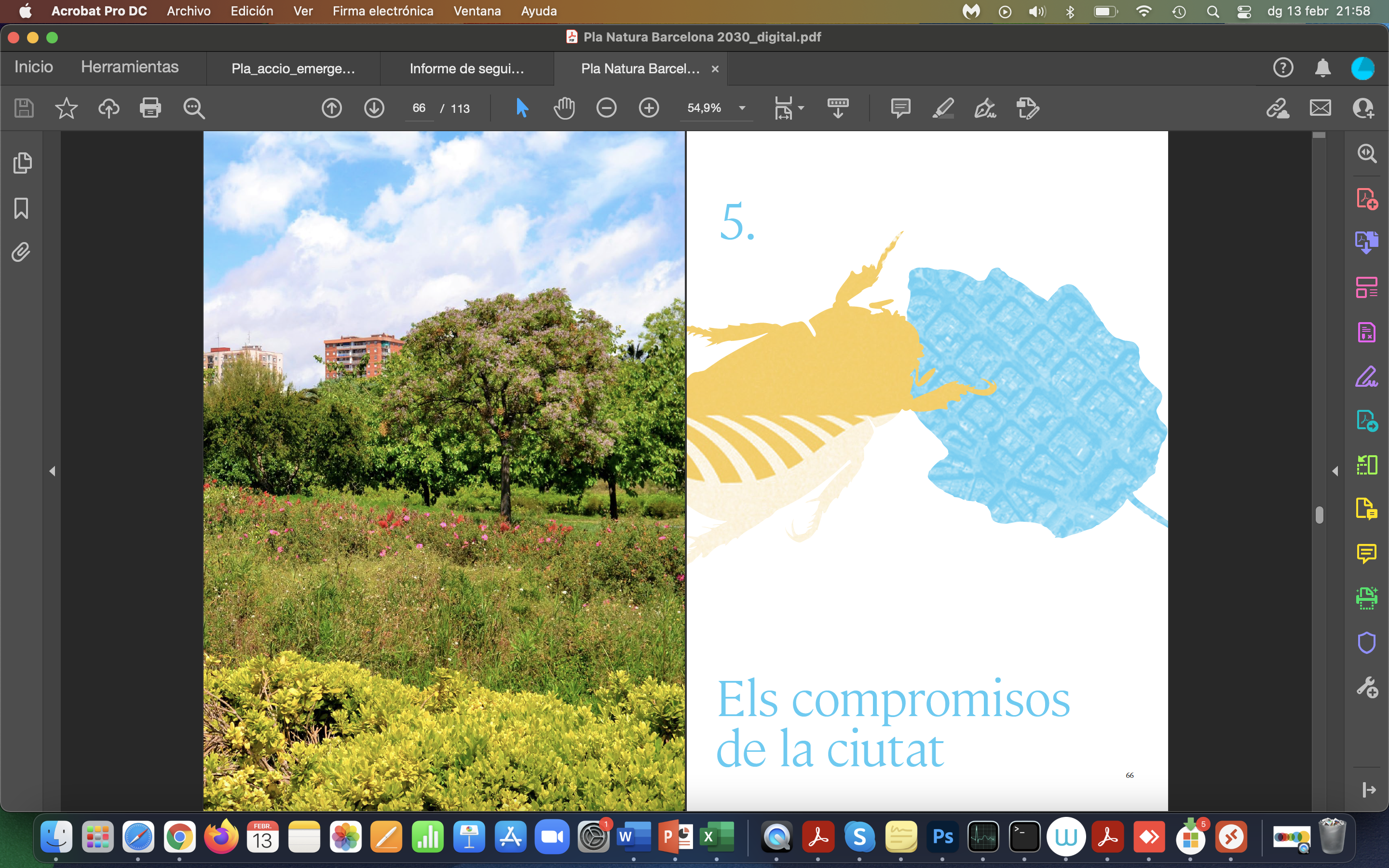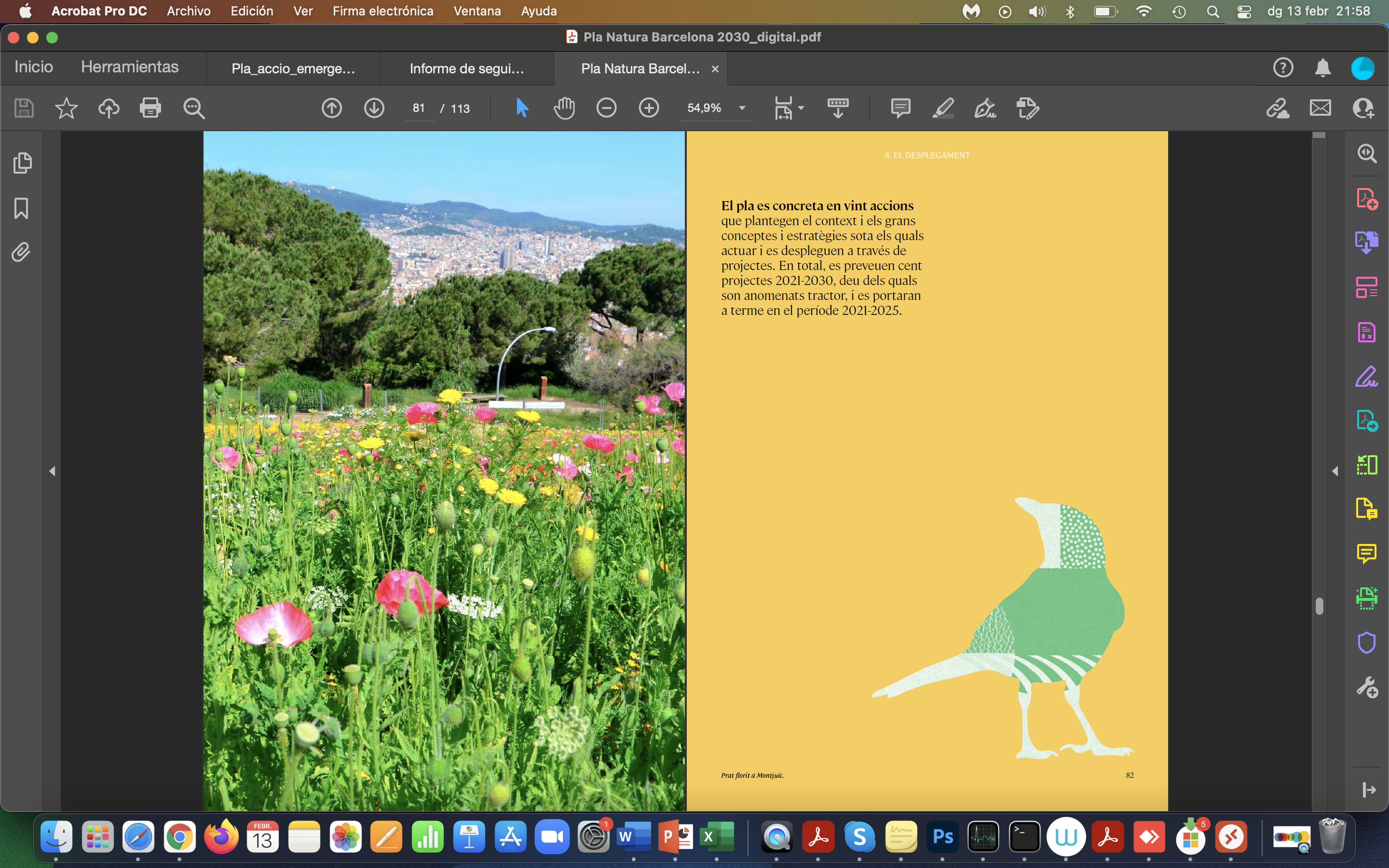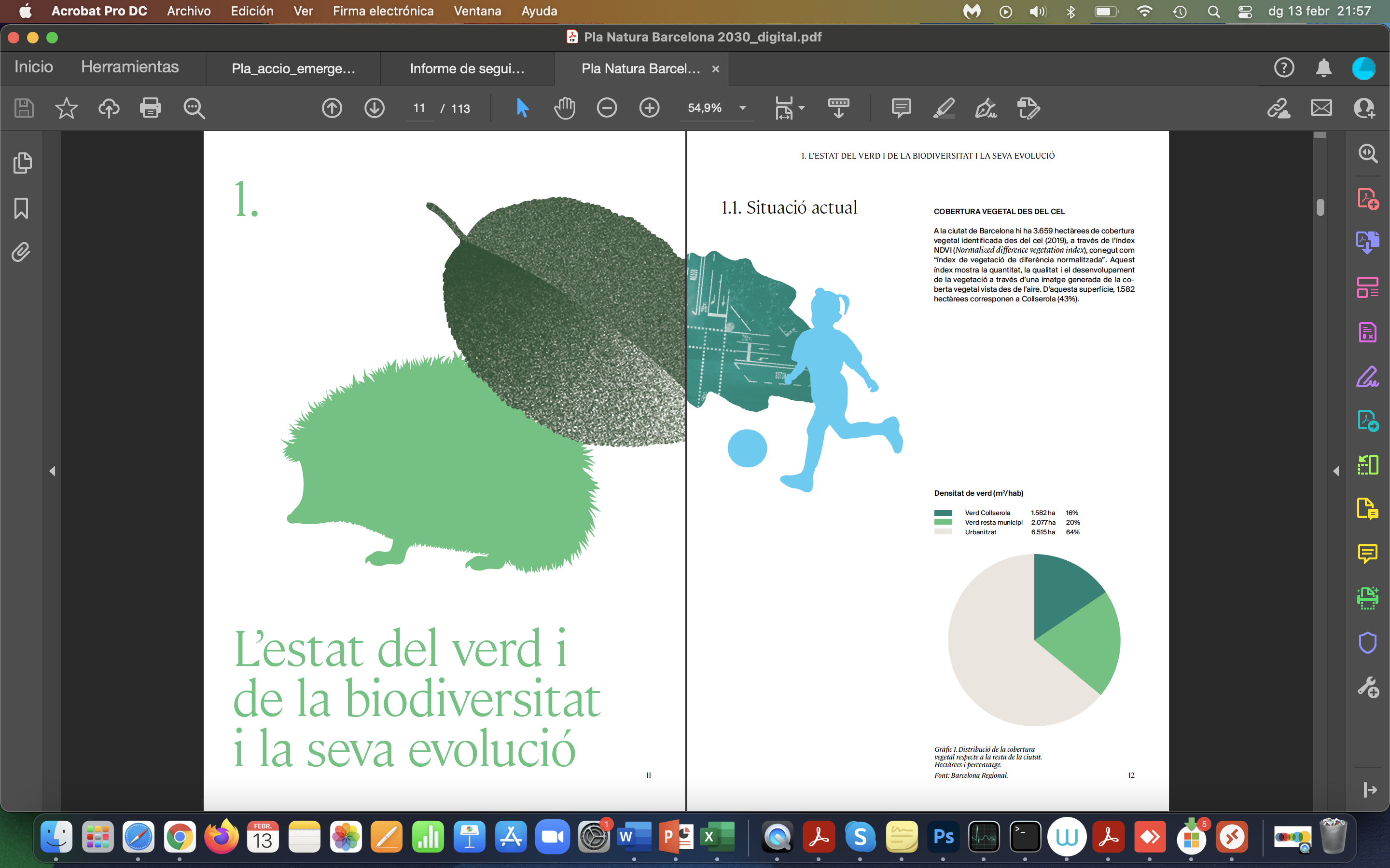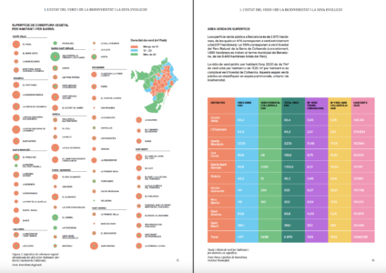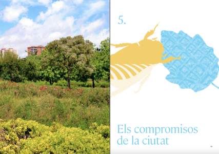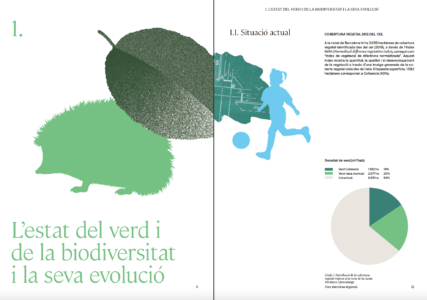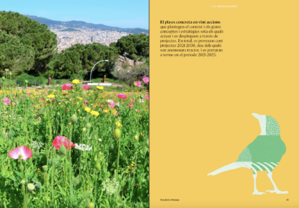 El Pla Natura combina il·lustració i taules colorides, fotografia a pàgina sencera i també incrustada en il·lustració… sempre combinant elements urbans amb elements naturals.