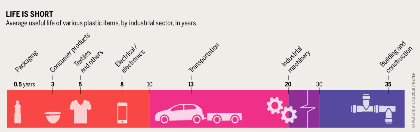 Per tant, el plàstic, present a les nostres vides de manera massiva des de mitjans del segle XX, ha permès millorar la usabilitat de molts objectes i adaptar-los a les nostres necessitats. Fins aquí, tot bé. El problema és quan la durabilitat i mal·leabililtat d’aquest material enlloc de donar forma a productes molt durables i útils, està generant una nova generació de productes d’un sol ús (normalment, envasos d’altres productes) que usem molt poc (no perquè el material no funcioni sinó perquè la seva finalitat com a producte ha finalitzat, contenir un altre) però que perduren molt (de mitjana, una bossa de plàstic triga uns 150 anys en degradar-se). Això vol dir que molts altres usos del plàstic no tenen durabilitats tan baixes i per tant, el seu impacte és menor (com mostra la següent figura).