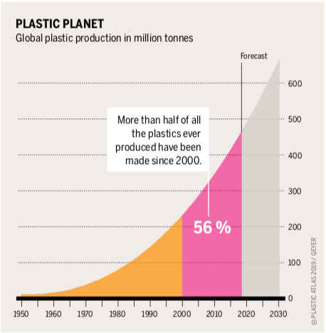 Els investigadors estimen que s’han fabricat més de 8,3 mil milions de tones de plàstic des de principis de la dècada de 1950. Al voltant de 60% d’aquest plàstic ha acabat en un abocador o en el medi ambient. Estem veient altres tendències preocupants. Des de la dècada de 1950, la taxa de producció de plàstic ha crescut més ràpid que la de qualsevol altre material. També hi ha una tendència creixent preferent a elaborar plàstics sol ús o d’un sol ús. Més de 99% dels plàstics es fabriquen a partir de derivats del petroli, el gas natural o el carbó, els quals són recursos contaminants i no renovables. Si les tendències actuals continuen, per a l’any 2050 la indústria del plàstic podria consumir 20% de tota la producció global de petroli.