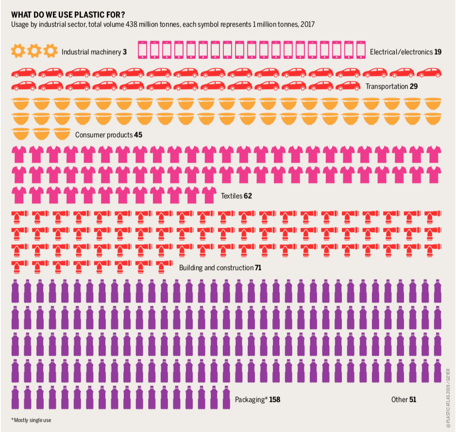 El seu nom respon a una de les seves principals característiques: la plasticitat, és a dir, la capacitat de deformar-se sense arribar a trencar-se. La seva mal·leabilitat, lleugeresa i resistència mecànica, a més de la seva fàcil i econòmica fabricació, li permet donar forma a objectes diversos amb múltiples possibles usos. De fet, quan pensem en l’aplicació del plàstic cal anar més enllà del packaging (clarament l’ús que més plàstic consumeix, com mostra la següent figura) o de l’envàs alimentari, i reconèixer-lo també en adhesius, pintures, circuits integrats, carcasses d’ordinadors, condensadors, material electrònic en sectors com la construcció, l’edificació, la mobilitat o l’atenció sanitària. Estan arreu tot i que no en siguem conscients.